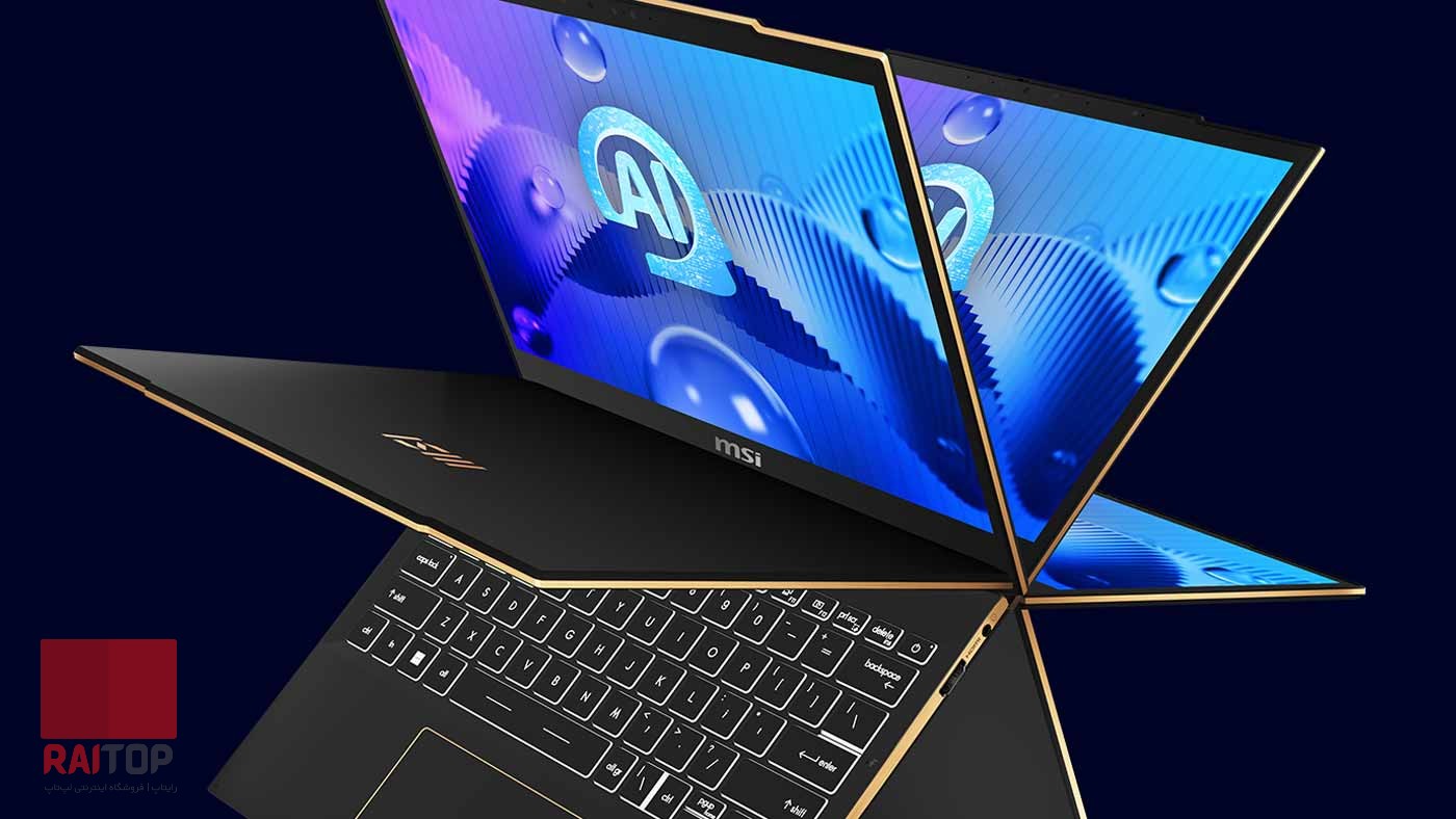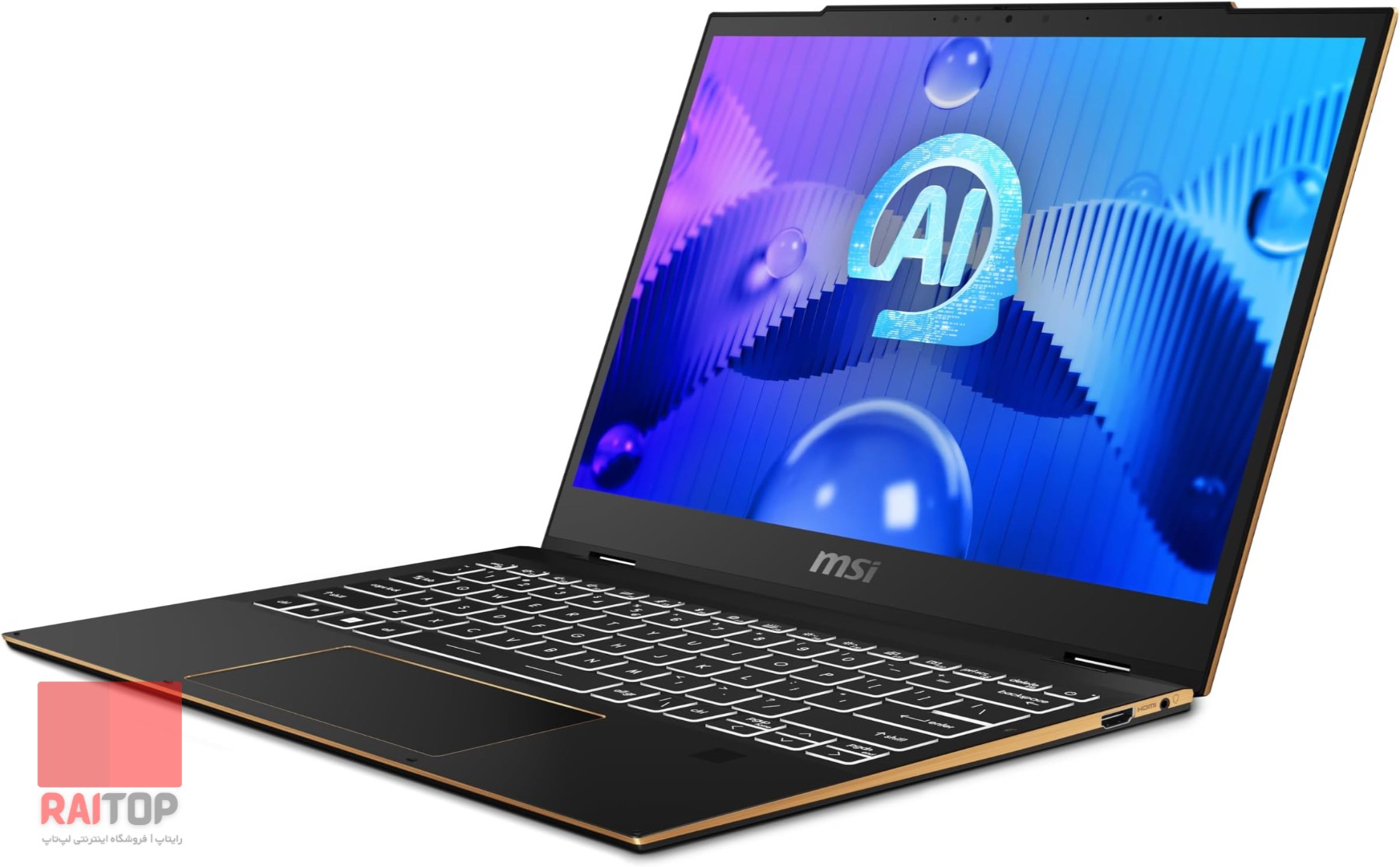 لپ تاپ MSI مدل Summit E13 AI Evo A1M با طراحی یکتکهی فلزی (CNC Uni-Body) و رنگ خاص Ink Black جلوهای مدرن و حرفهای دارد که حس یک محصول پریمیوم را منتقل میکند. تمام لبههای بدنه و درب دستگاه با نوار طلایی ظریف تزئین شدهاند که جلوهای خاص و چشمنواز به آن میبخشد. ✨